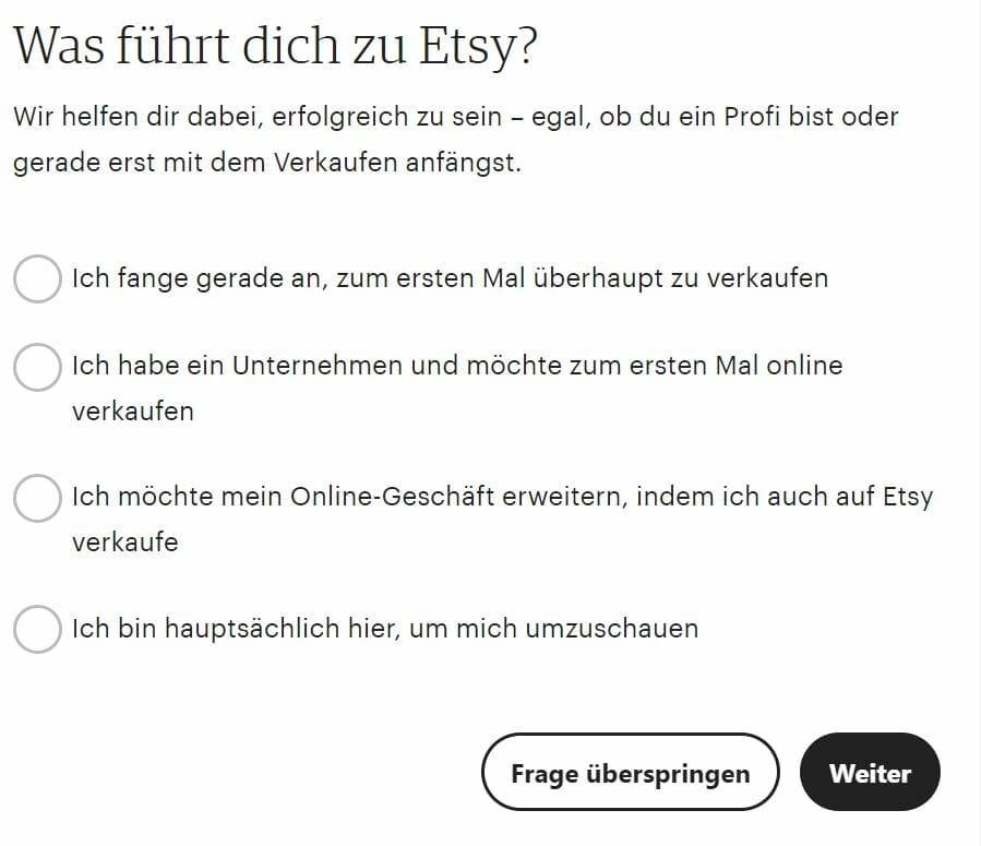 Bevor es an die Eröffnung deines Shops geht, fragt Etsy dich nach deinen Erfahrungen und Wünschen.