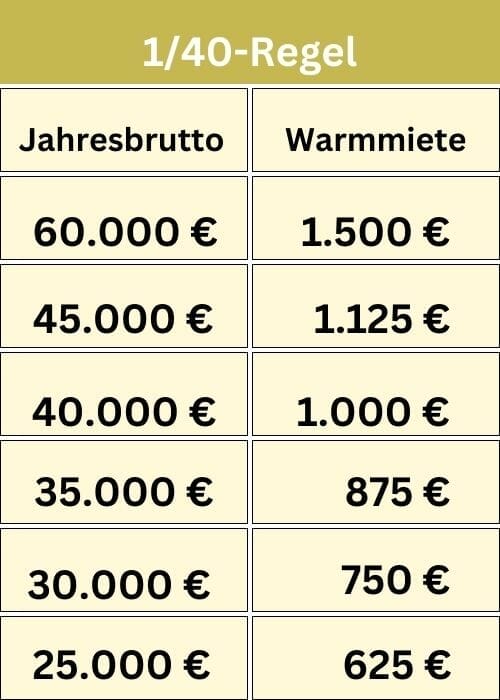 Als Alternative zur 30%-Regel gilt die 1/40-Regel, die sich am Bruttojahresgehalt orientiert. Die 1/40-Regel besagt, dass dein Jahresgehalt mindestens 40mal höher sein sollte als deine Monatsmiete. Das bedeutet also das deine Miete 1/40 deines Jahresbruttos betragen sollte.