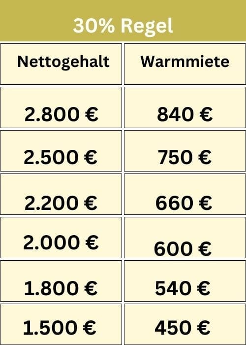 Laut der bislang gängigen 30%-Regel solltest du maximal 30% deines Nettoeinkommens an Miete bezahlen. Mit einem Nettogehalt von 3.000 € sind dies maximal 900 € Miete.